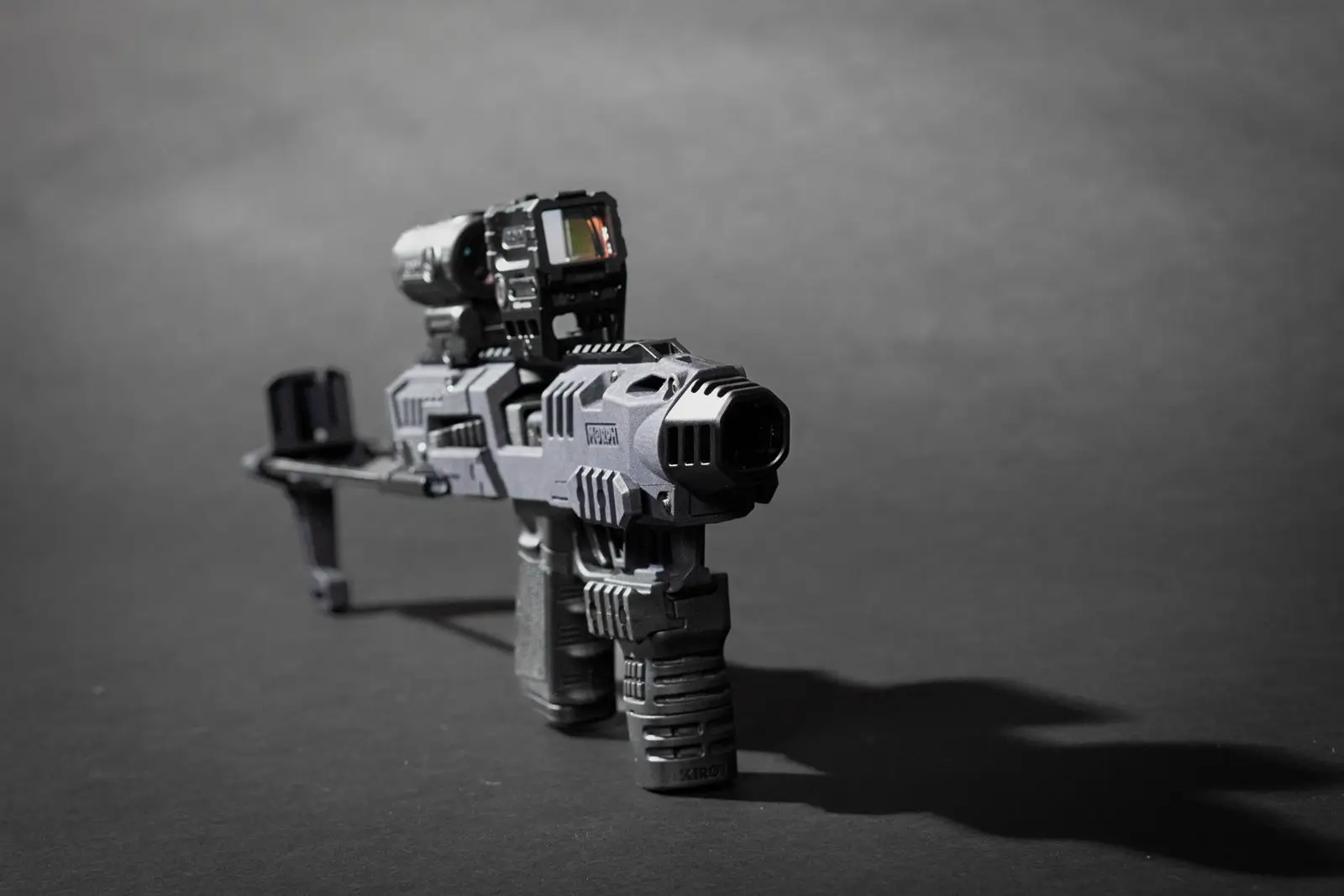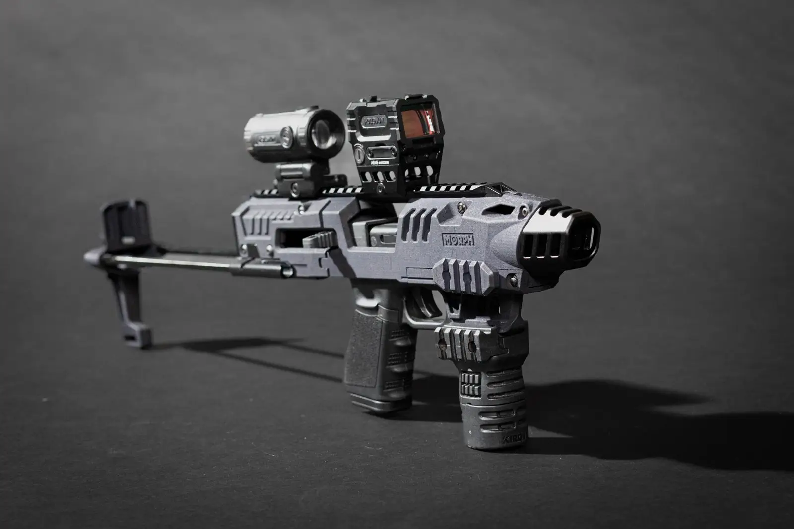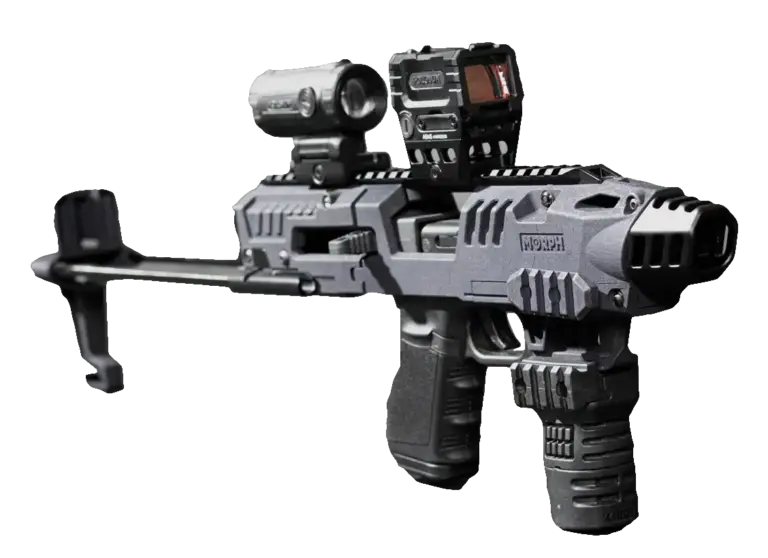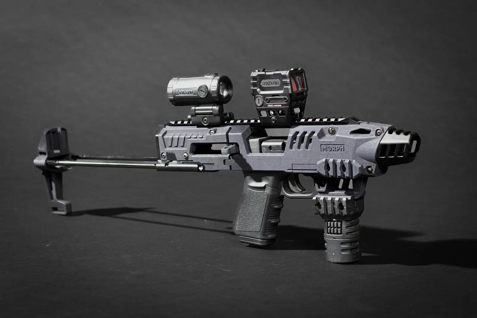 The Morph is a conversion kit with spring-loaded brace for Glock Gen 3-5. IT is made of aircraft grade aluminum and steel and feature a rapid deployment stock using the spring-loaded brace. It includes a full length upper Picatinny rail, two side rails a rail at the bottom, so you won’t have any shortage of mounting space for your accessories.